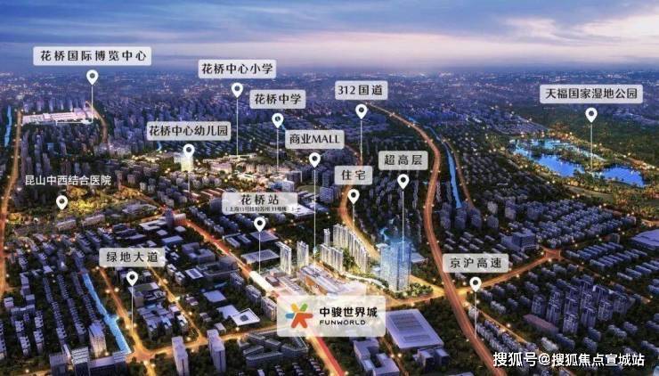 交通配套:距离地铁 11 号线花桥站 175 米,与苏州 S1 号线(建设中)交汇,东临沿沪大道、北临 312 国道。