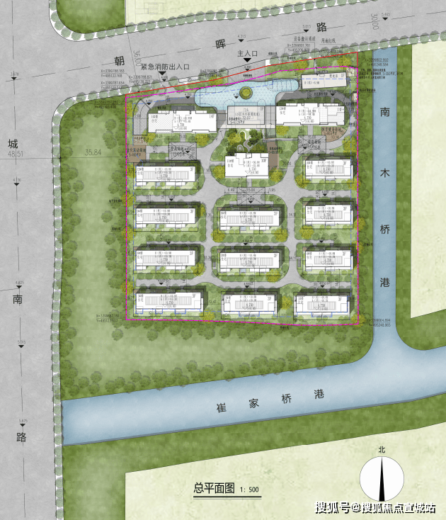 地块位于城南路旁,却不紧挨,绿化退让足足约35米。东南两侧,双面临水,颇有玉带环腰之姿,这先天禀赋近乎顶配。