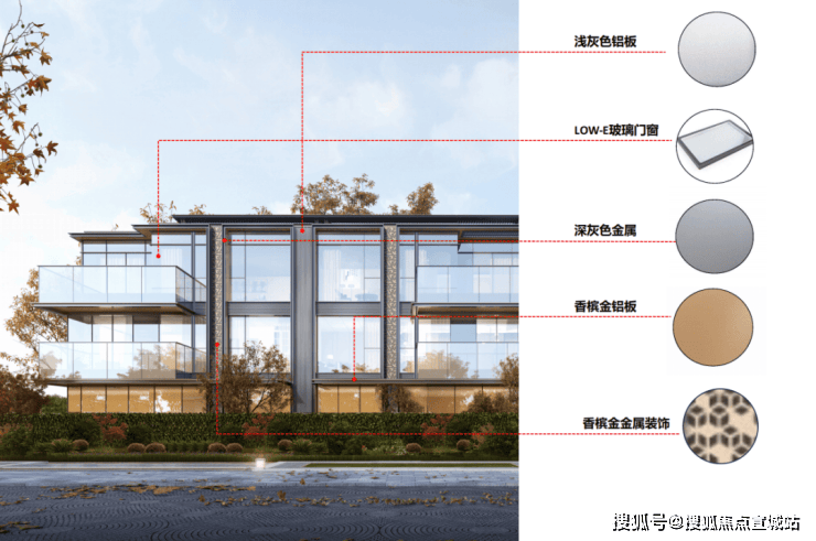 南北两面都采用了大面积LOW-E玻璃代替墙体,搭配香槟金铝板线条和灰色金属格栅,提升美感的同时,又扩大了采光面,极具辨识度。