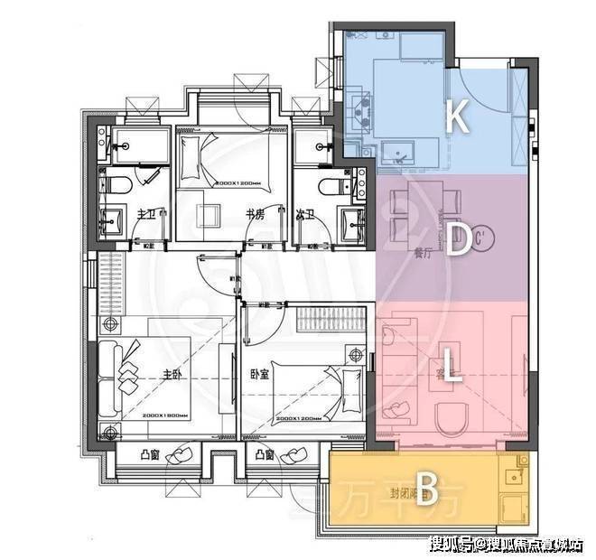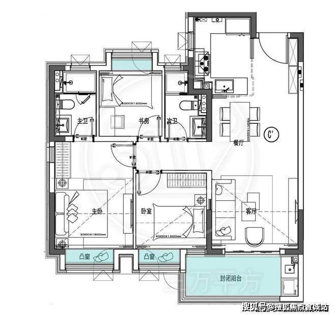 而北向房间则布置了次要的厨房、次卫、书房和主卫功能,做到功能层级合理的基础上,最优化的提供南向面宽和缩窄户型整体进深。这样带来的优势就是户型整体的采光和通风都极为优越!