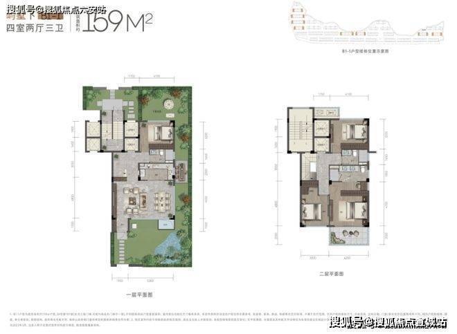 下叠:270°环抱花园(60-100㎡)+下沉庭院,L型半包围客餐厅(约7.2米面宽),独立老人房;