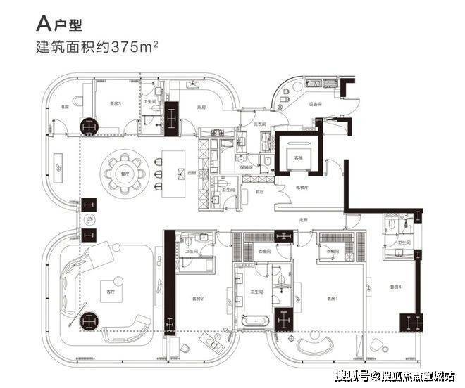 面积:375㎡,赠送约107㎡,得房率约93%,户型设计6房6卫,