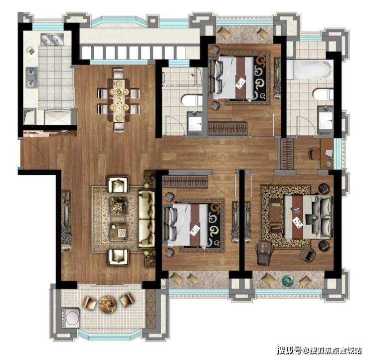 建面约95㎡2房,创新户型,全明设计。在一体化设计的客餐厨阳台中,一家人平时聚在其中,无论是坐在沙发上歇息、在厨房中烹饪、在饭桌上吃饭,窗外的风景都是生活的点缀。