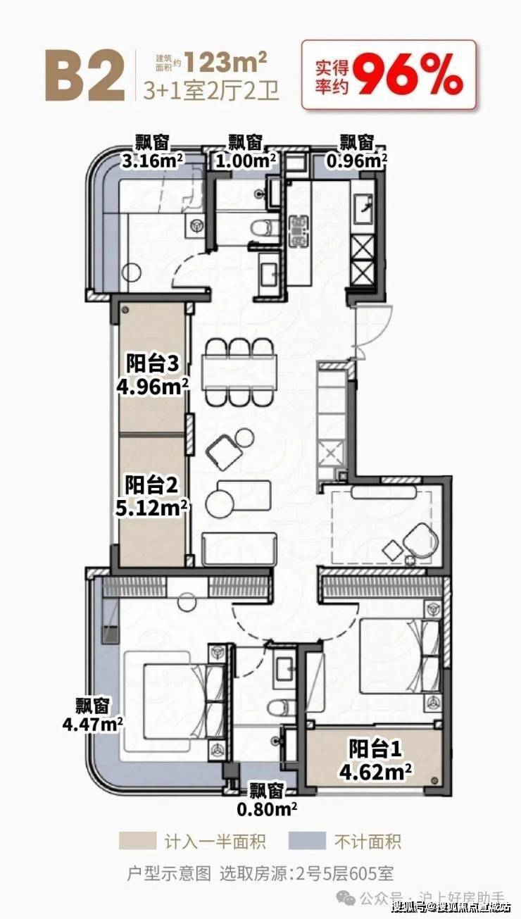 阳台+飘窗算下来,约108㎡户型的实得率达到了惊人的约87%,实得面积约94㎡!