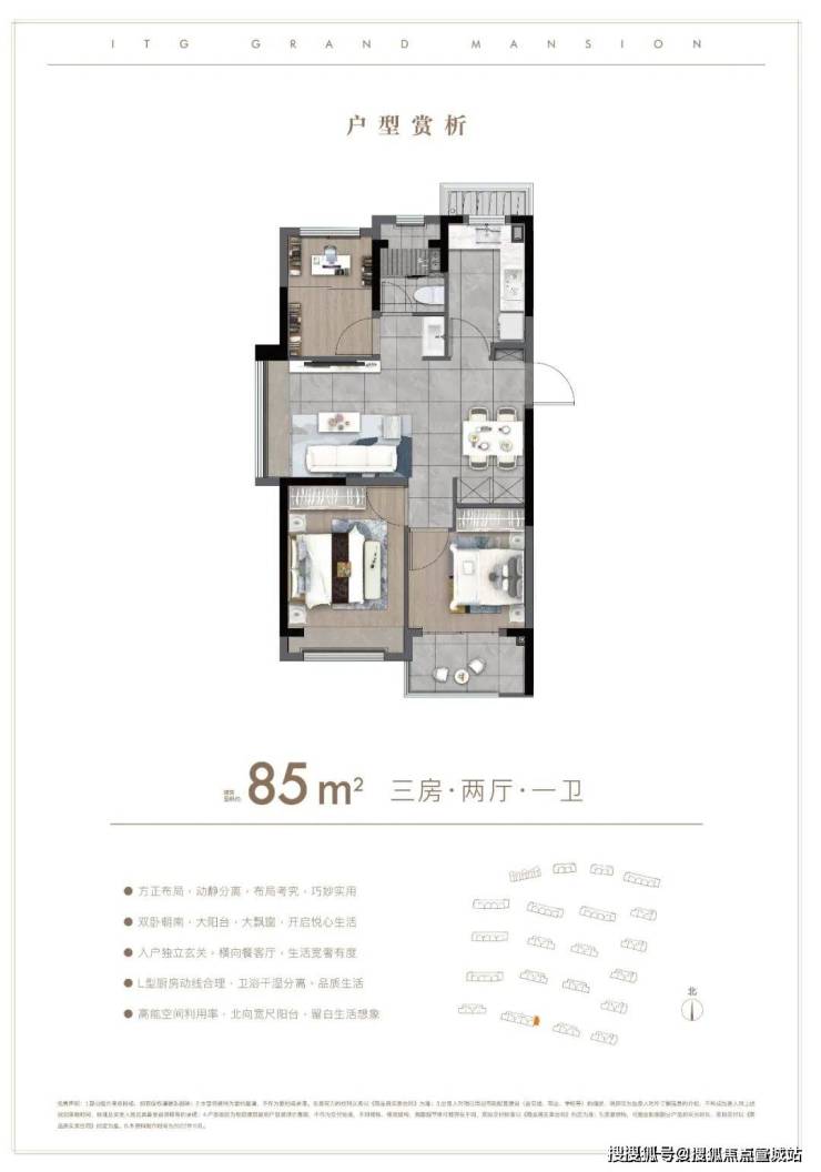 户型解析: 约85㎡的3房,这种入门级的产品也要保证居住的尺度感。比如利用L形厨房与餐厅相连接,一体化的设计让空间充足利用。比如次卧连接阳台,就是人性化考虑到给他们一个私密的追光天地。