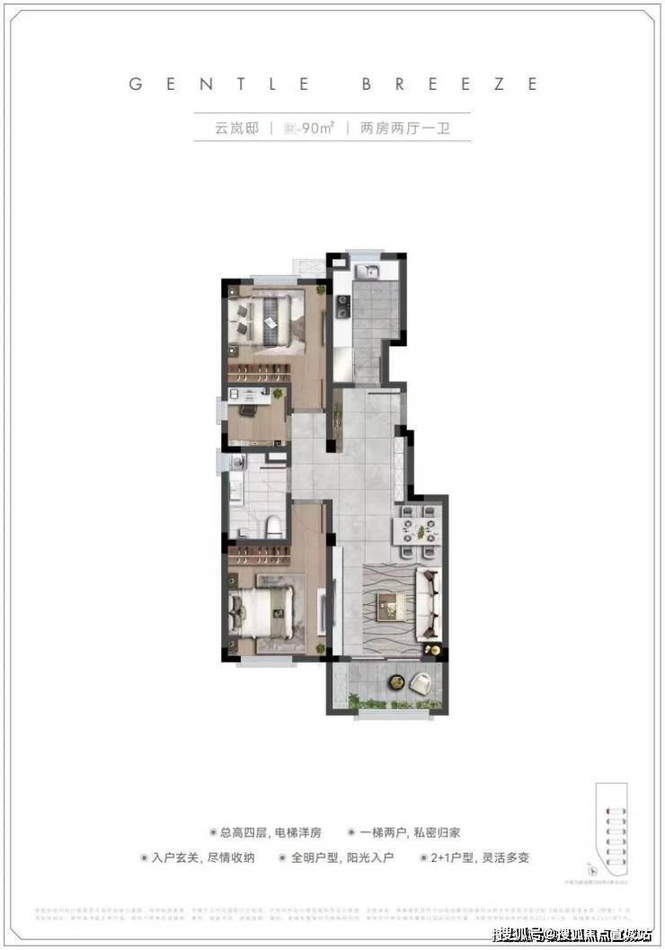 洋房:建面约 80-90㎡,总高四层,一梯两户,均价 25000 元 /㎡起,总价区间 196-270 万,可选精装或毛坯交付。