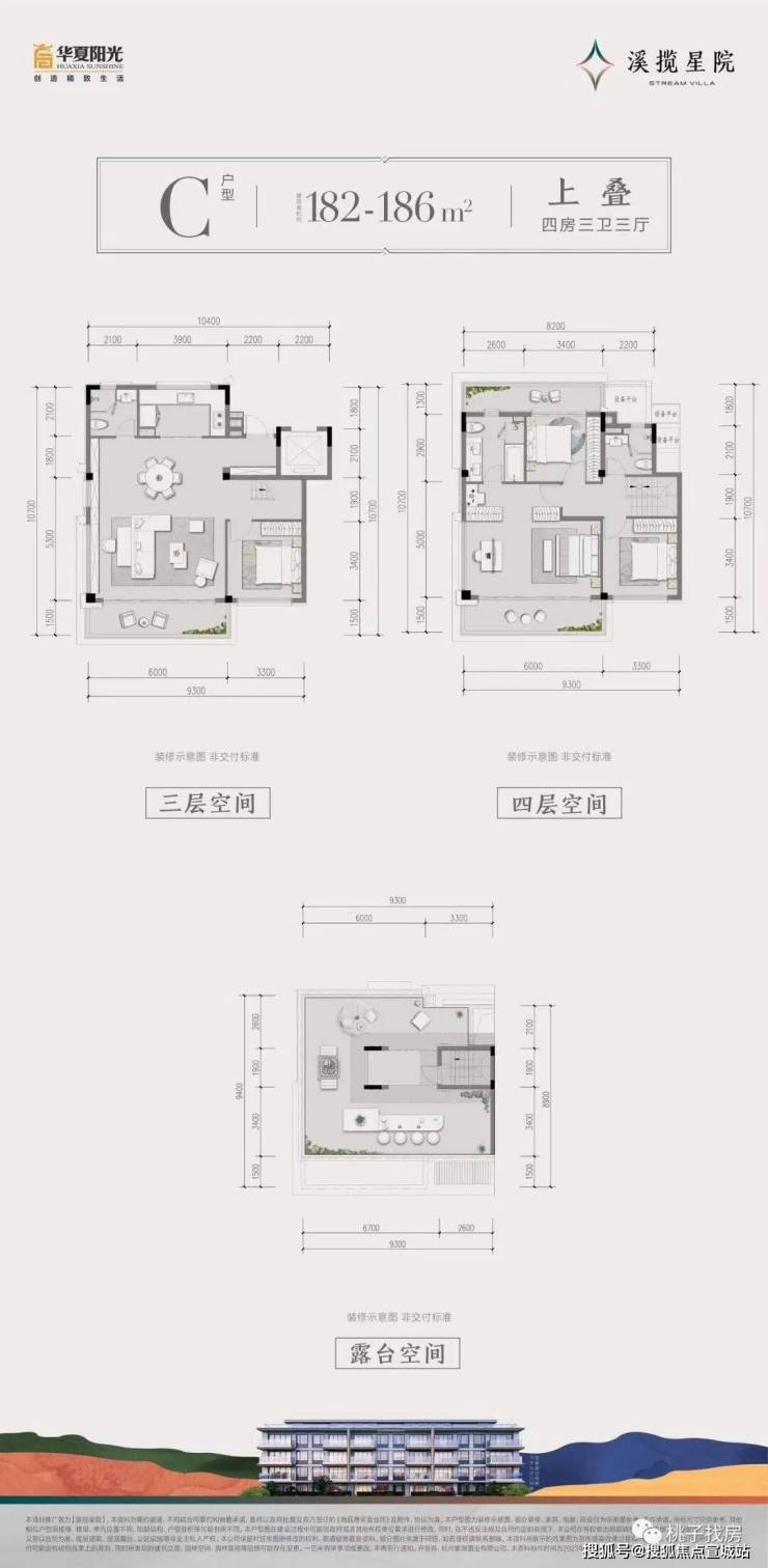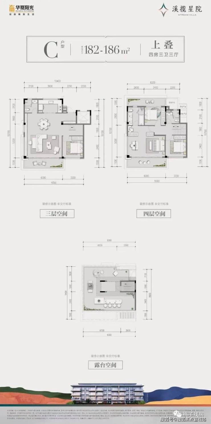 建面约182~186㎡上叠:约6m顶层观景阳台/餐客厅、书房开放设计/套房式主卧