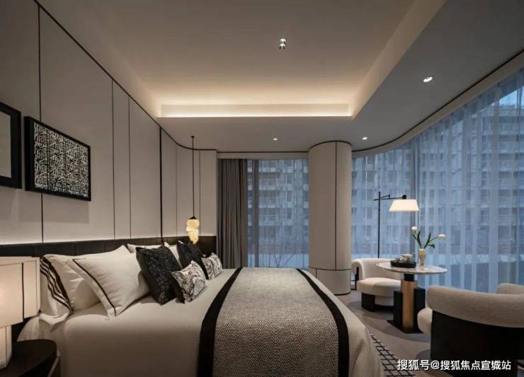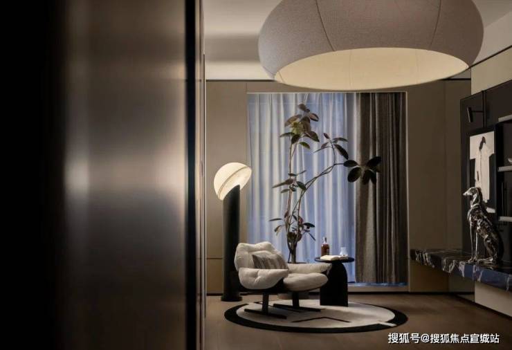 主卧以柔和的灰白色调为基底,陈设的点缀恰如其分。落地窗前,一张休闲椅与小圆几静静伫立,成为欣赏江景的美好角落。生活在此,成为一场永不落幕的风景。