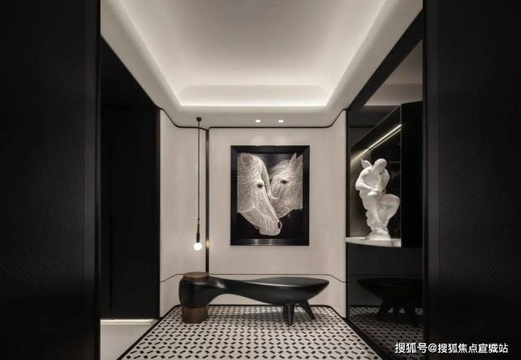玄关黑白分明的色彩搭配,展现出一股现代都市的时尚气息。端景处的艺术画跃然眼前,画下的长凳,同样以黑色呈现,与上方的画作相呼应,深邃的色调和独特的笔触,成为玄关空间的点睛之笔。