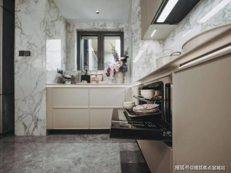 该项目在大件设施上配备十分齐全,中央空调/地暖两联供、新风系统一应俱全,升降式为业主营造舒适的居住环境。厨房的配置更是让人眼前一亮,除了常规的灶具、吸油烟机,还加配了蒸烤一体机、洗碗机、冰箱和条形凉霸,全方位提升了生活的便捷性和品质感。