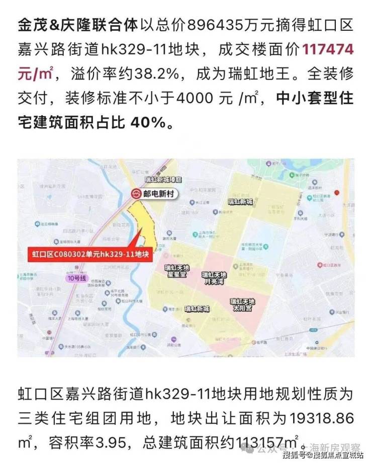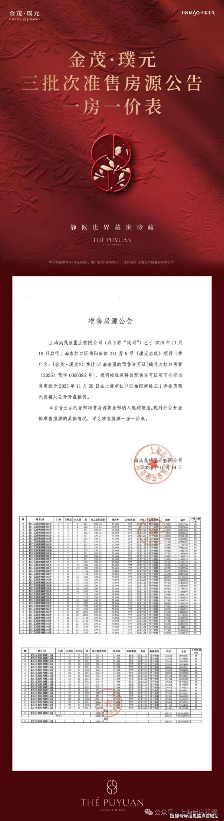 最新消息!上海2025年首个地王“瑞虹地王”金茂+庆隆瑞虹项目正式定名「金茂·璞元」首开售罄!三期建面约200㎡4房;均价16.81万/m²,总价2800-3670万!一梯一户,得房率82-85%,高隐私、空间感强;售楼处线上火热预约中!