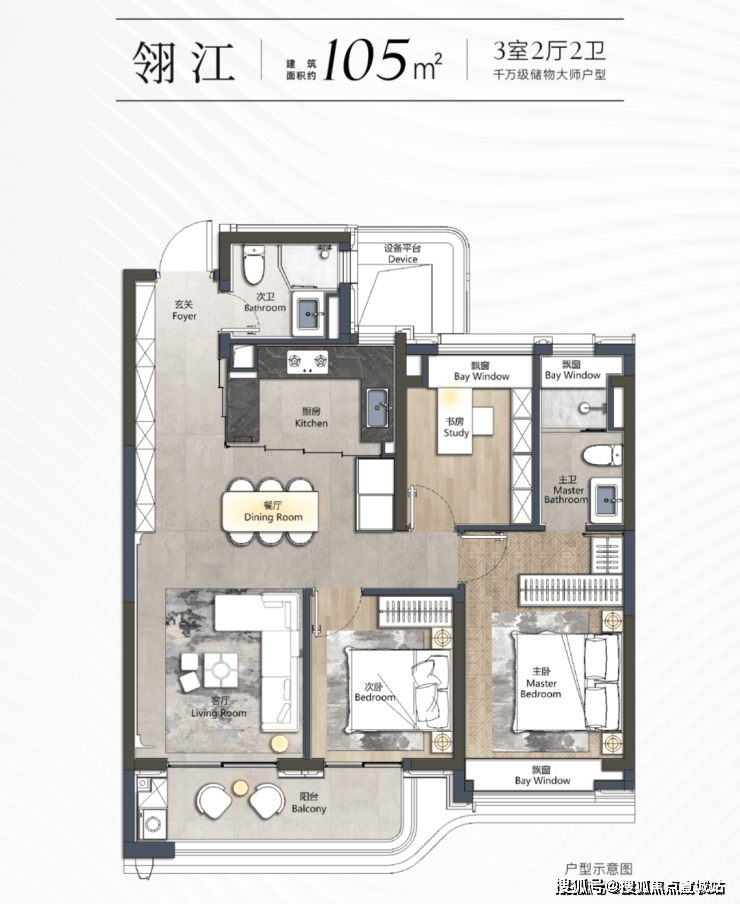 另外,一个优秀户型应该有的设计,包括入户玄关、3间卧室带飘窗、约270度采光面阳台、卫浴干湿分离...这个户型全部具备。