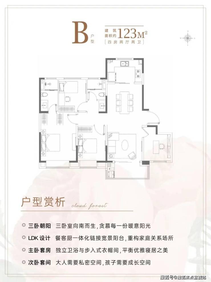 在当下100㎡及以下面积段占绝大多数的情况下,建面约123㎡4房本就十分稀缺。而在产品设计上更加符合全龄段各种家庭结构的居住需求。