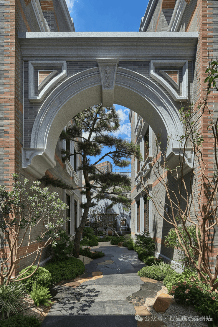 地面延续酒店式落客区海棠纹拼花镶钻,铁打纹工艺,其间还有老石板,青石板,中国黑老石皮,柏坡黄的石皮等原石原面铺装,老石皮从大料里取出,数量少而贵,由此也可看出保利·永兴里在别墅打造上是真舍得,也是真高级。