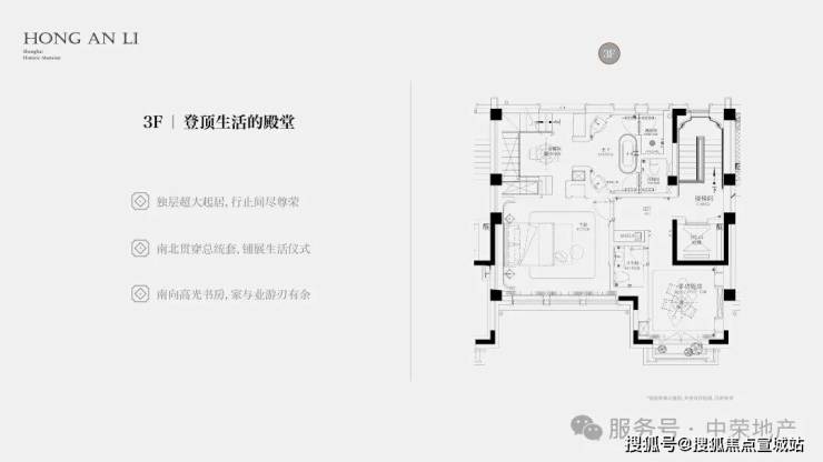 客厅互通,彰显家族生活的轩阔厅堂,2F家庭层,儿女的幸福与陪伴皆在左右,3F总裁套房式Penthouse,用具象的尺度描写人生成就的高度。