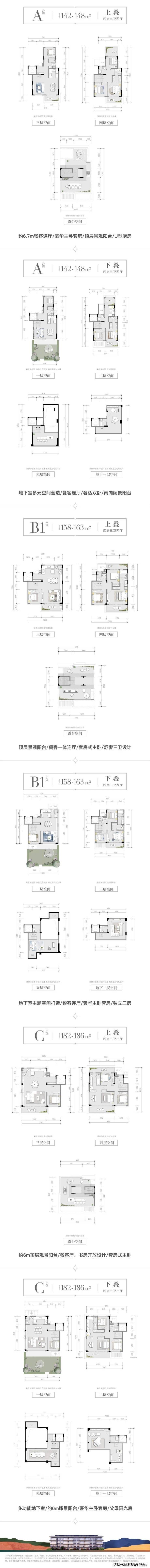 下叠:142-186㎡(赠送约50㎡花园+5.4米挑高地下室)5
