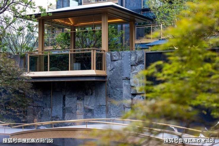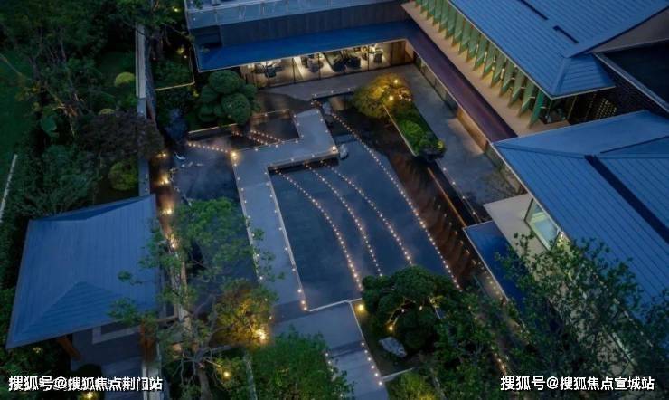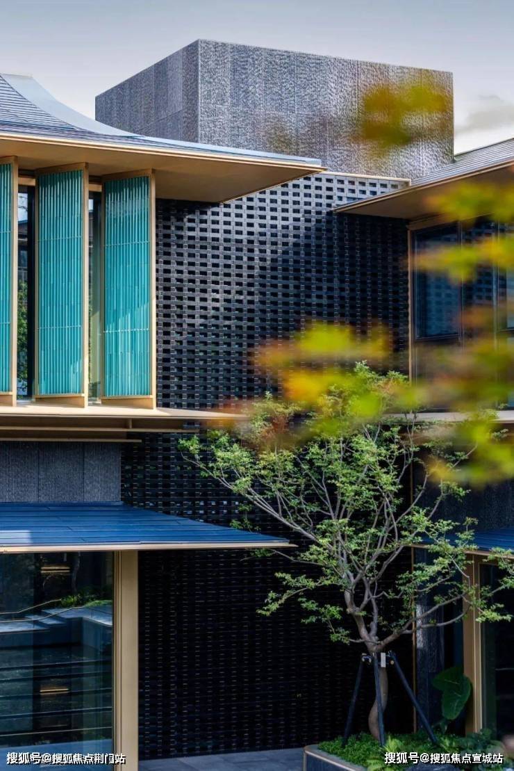 在立面打造上,提取“宋画”中的线条感,提取歇山顶样式,转译形成深远的挑檐,在视觉效果上给人以棱角分明、结构清晰之感,整体呈现一种清雅内敛的当代气质,大尺度巨幕玻璃窗镶嵌金色铝线条,如画框一般,攫住窗外的每一寸风景,让建筑隐于自然