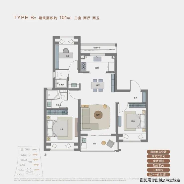 B2户型则是含金量非常高的南北通透飞机户型,动线更加合理。