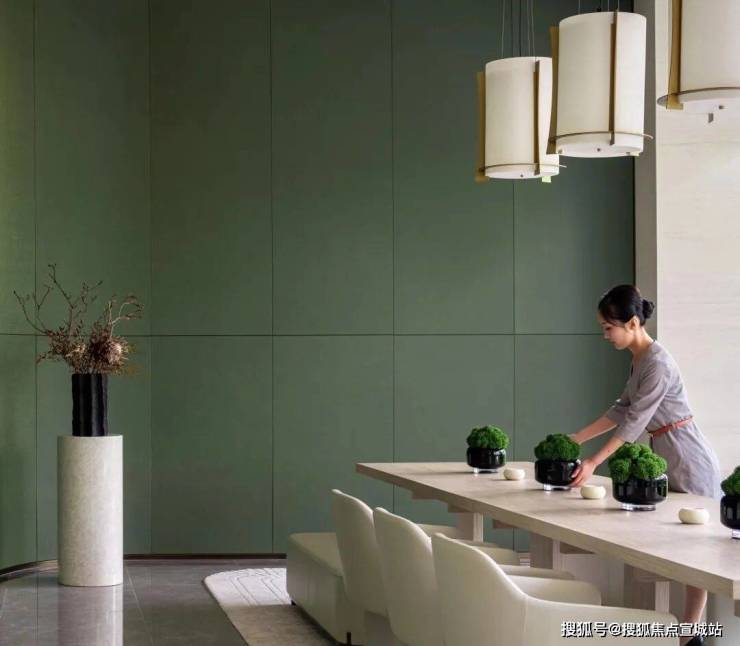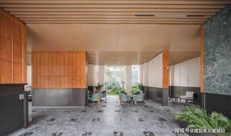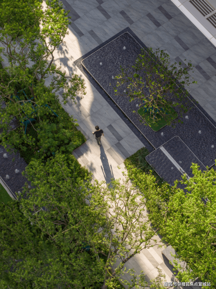 同时,社区内部景观打造了大面积的叠级水景,搭配普拉达绿大理石和浪淘沙石材,呈现整体空间的隐奢基调。