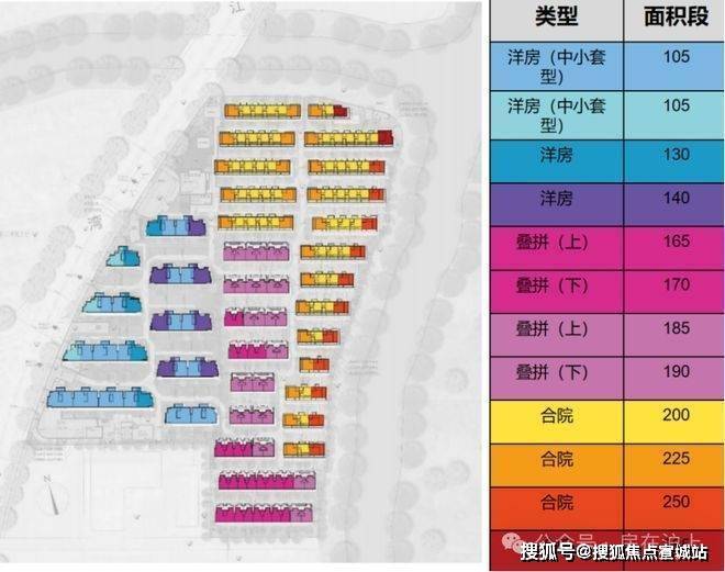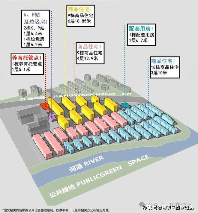 地块容积率1.1,用地面积57099.23㎡,计容建筑面积62809.15㎡,建筑限高20米,规划为低密洋房+别墅社区,西高东低,拟建9栋6层洋房、9栋4层叠加、18栋3层联排,规划总户数438户。