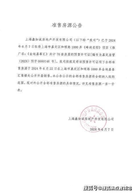 金地·嘉峯汇|准售房源公告及一房一价表: