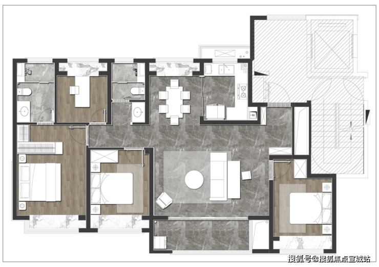 在设计之初,森兰·航荟名庭就考虑到了连廊带来的潜在负面影响,因此整体采用一梯两户无连廊的设计方案,从根本上解决了隐私和采光影响。