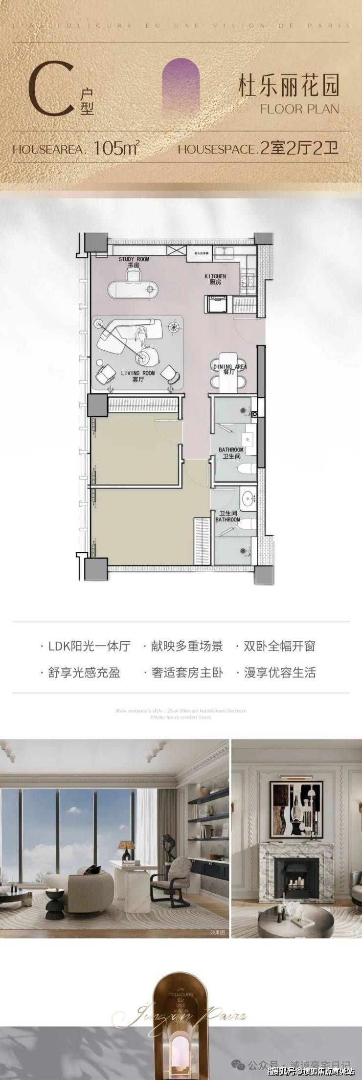 户型主题:105㎡为杜乐丽花园主题,165㎡为香榭丽舍和薰衣草庄园主题,185㎡为塞纳河畔主题,200㎡为枫丹白露主题。