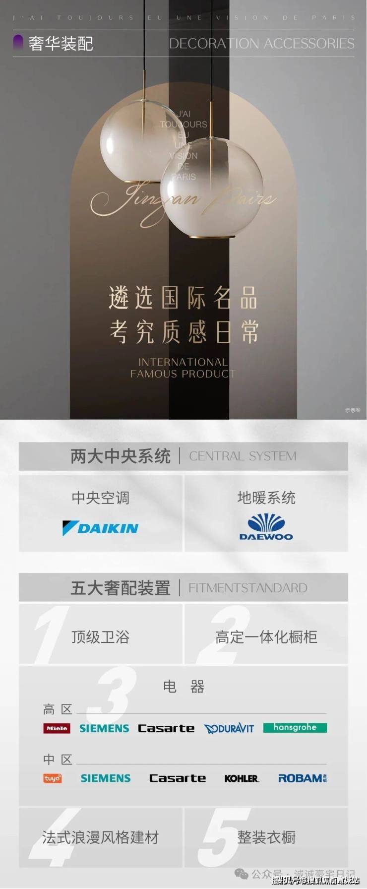 装修标准:法式精装交付,装修标准为 8000 元 /㎡,配备中央空调、地暖、新风系统。