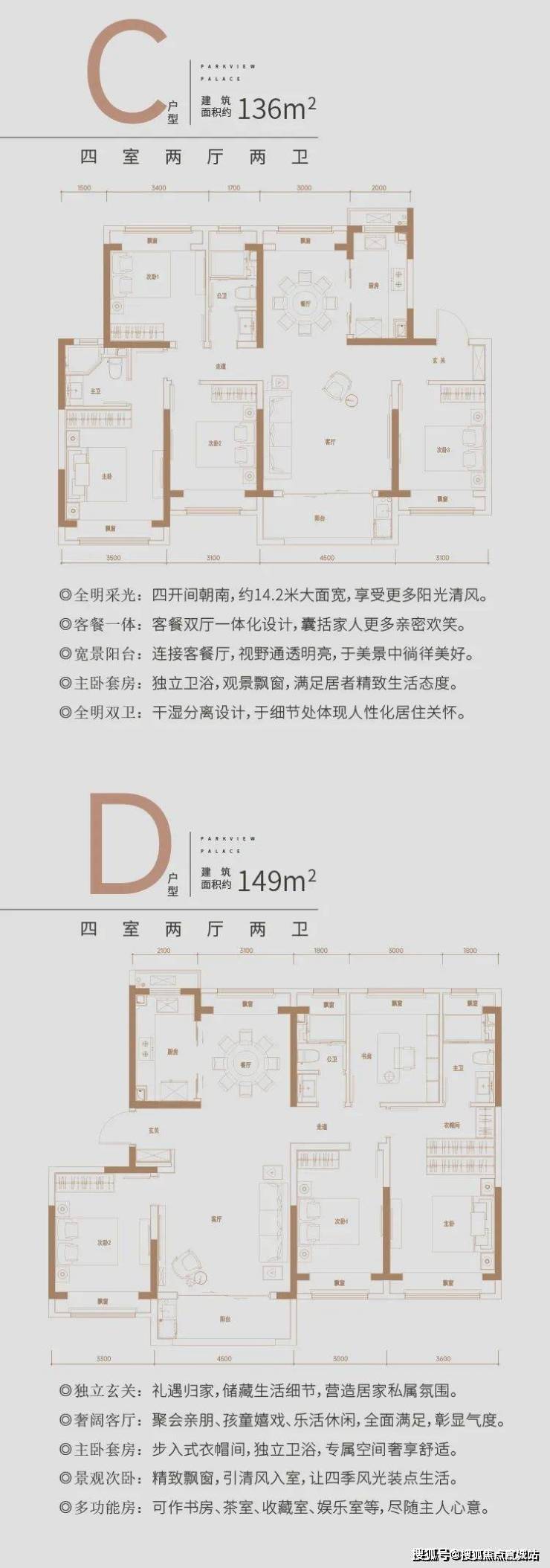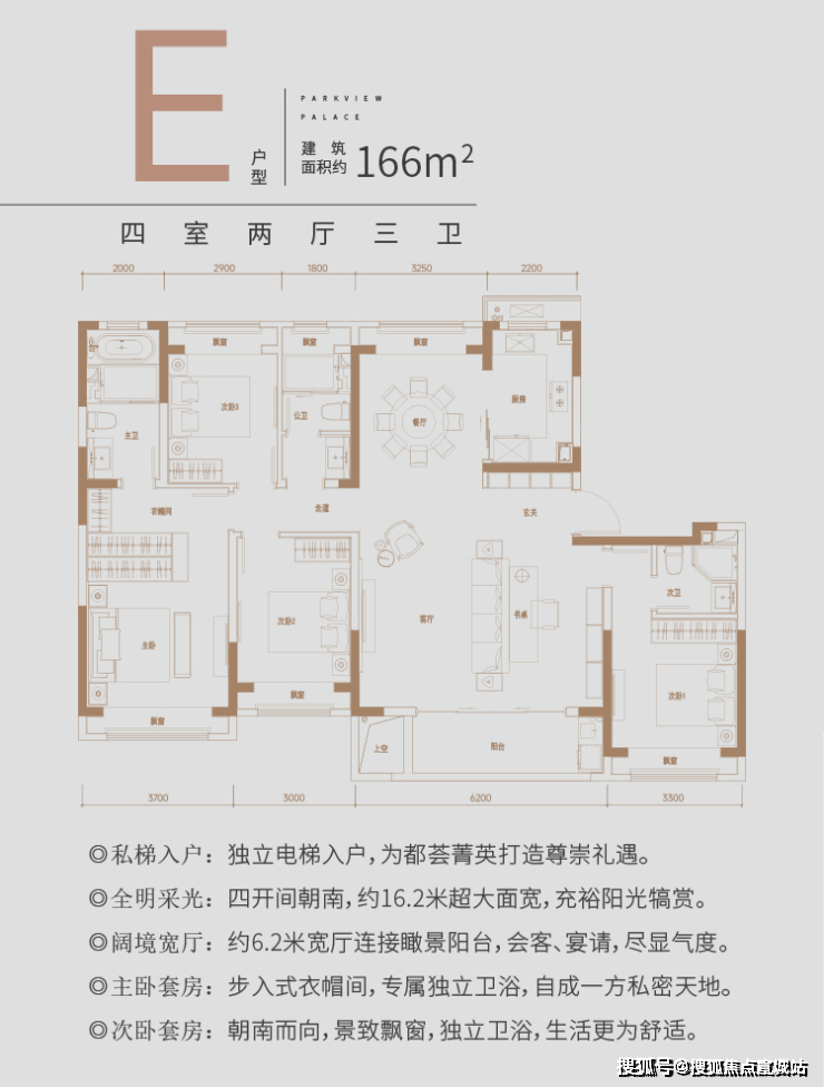 建面约165㎡奢境户型,南向四开间面宽可达约16.2m,约6.2米宽厅连接宽幕阳台,突破性尺度设计,带来通透的全景视野,一眼望向城市自然与繁华,居住于此,大平层的尊崇奢居体验油然而生。