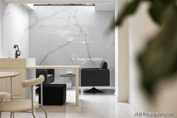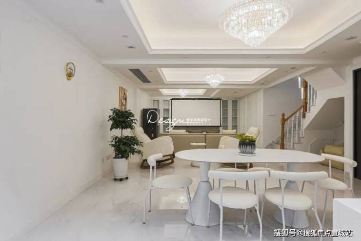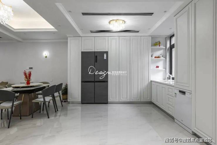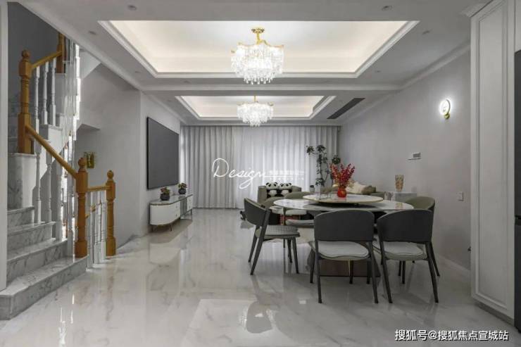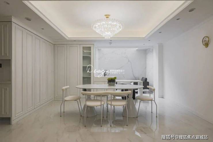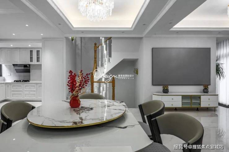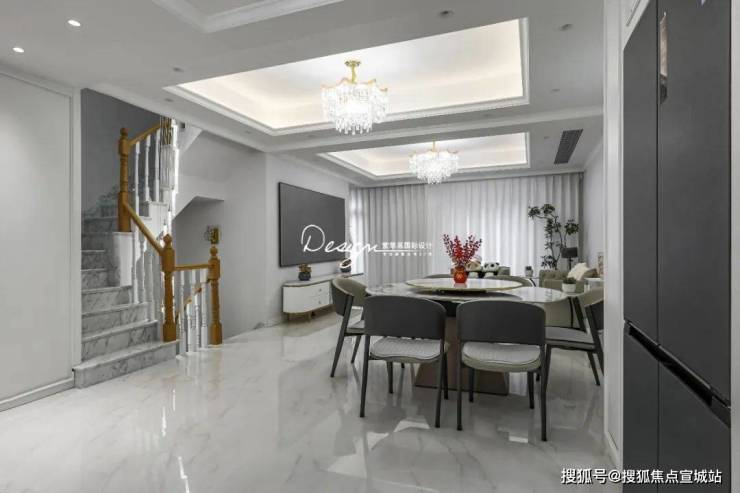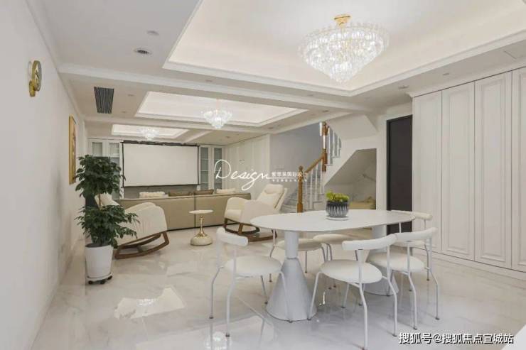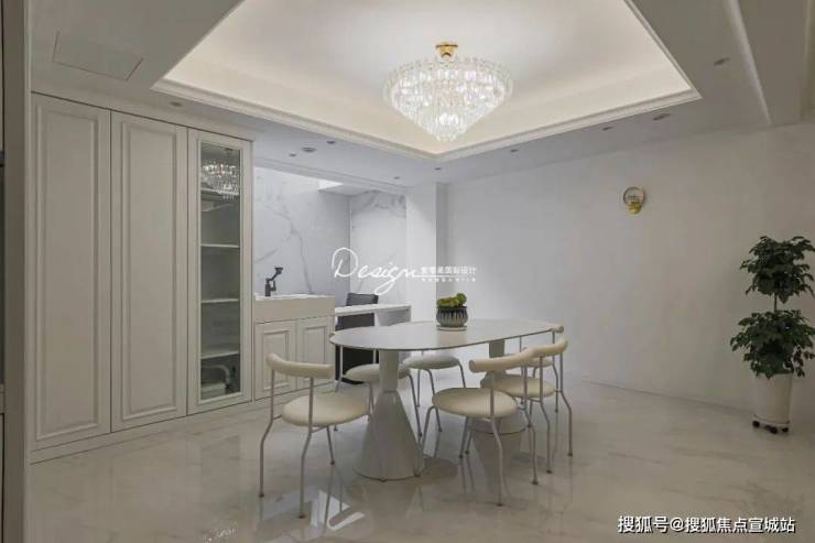上海宝山金地天地云墅营销中心热线:400-8778-334-因为是联排别墅,所以虽然有4层楼,但每一层的空间其实并不是特别大,因此在设计时,以白色、浅色以及有镜面感的色调和材质为主。一楼主要还是由玄关、餐厅、客厅、厨房四个部分组成,不进行任何形式的隔断,通铺的浅色地砖加上大面积的白墙,不做过多的修饰,让整个空间有很好的通透感和延伸感;石膏板吊顶和吊灯划分了玄厨、餐厅、客厅三个区域,使得各个区域功能分明。