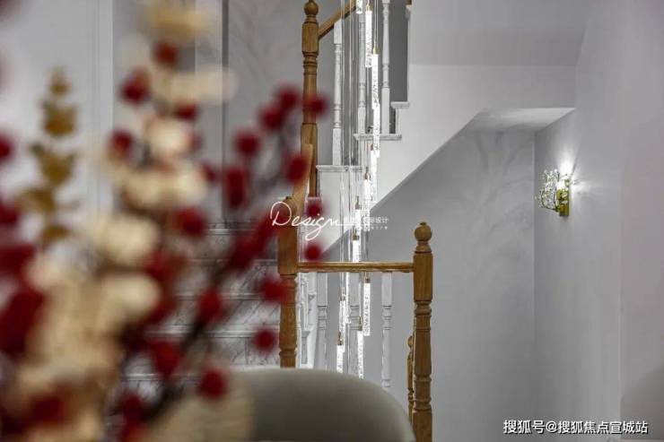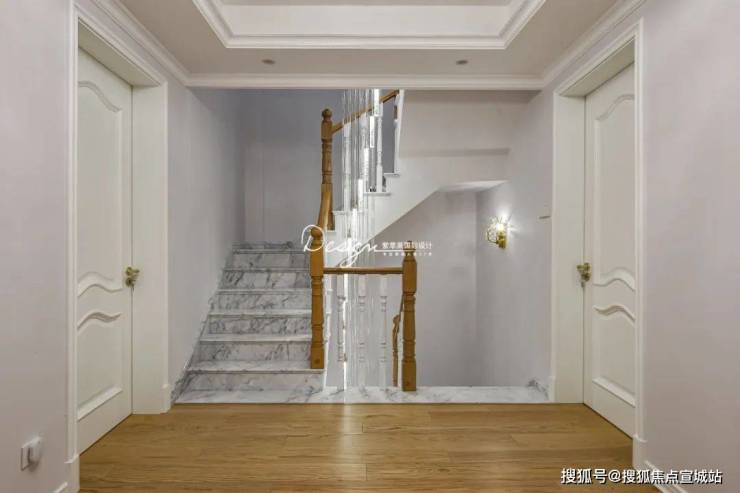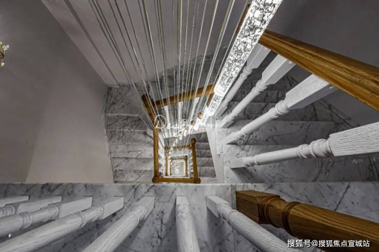 The long spiral crystal chandelier runs through the entire basement to the 3rd floor staircase, and when viewed from the top down, it will have a good visual effect. The fish belly white marble staircase, paired with wooden European style columns and handrails, gives the entire staircase a luxurious and natural appearance. Of course, the European style wall lamps on the white wall are the highlight of the entire staircase, and the leaf shaped curves also make the surrounding space appear much more gentle.