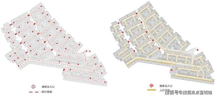 不同于往期人车混行的动线规划,为了让渡更多的地面空间给到景观及庭院,本区块采用了大底板地库来解决停车及车行入户空间,于是人行之外增加了地下动线。