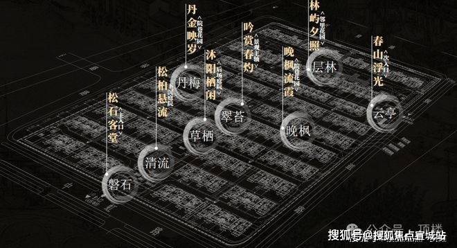 8大景观节点:营造可行、可观、可游、可居的东方诗意天地。①松石客堂-主入口;②松桕悬流-下沉庭院;③沐阳栖闲-后场庭院;④吟赏春灼-景观主轴;⑤丹金映岁-院巷花园;⑥晚枫流霞-院巷花园;⑦林屿夕照-邻里花园;⑧春山浮光-次入口