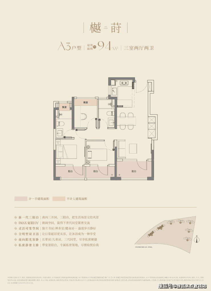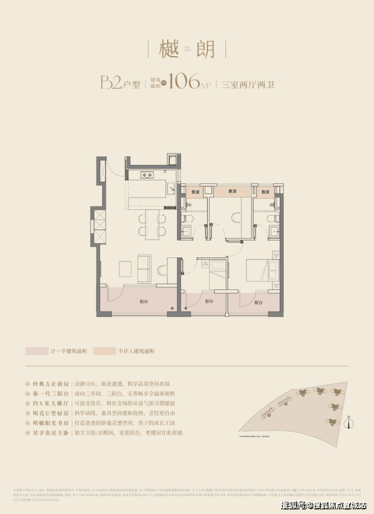建面约106㎡的三房两厅两卫,3.5开间朝南,南向面宽达到约11.8m!碾压市面上以前的三开间朝南、10米面宽的三房户型。