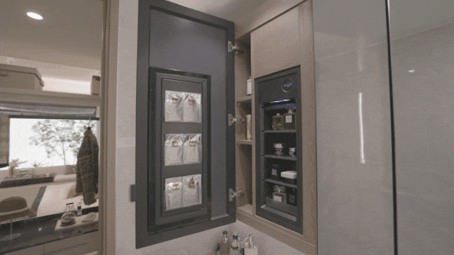 此次主卫的细节,更是让人惊艳,绿城对生活美学的考究真的让人感叹,绿城“武器库”的尽头到底在哪里?美妆冰箱的设计,充分考虑到女主人的生活精致感。