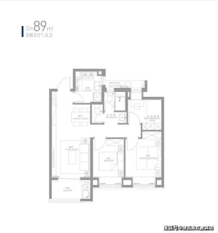 约89㎡三房,1.5卫设计为临港首创,在总价可控的基础上兼具实用性。