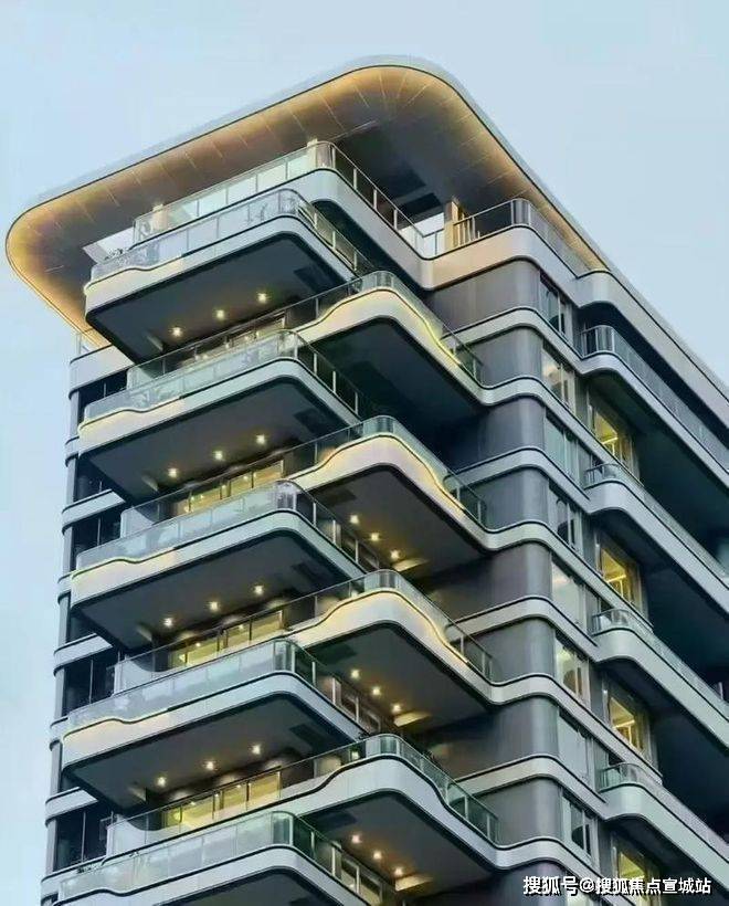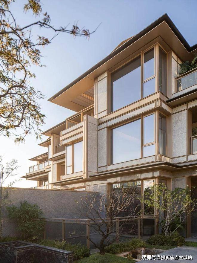 立面设计以“现代形制,东方意境”为笔法。合院立面汲取传统“平座上建屋”的形制逻辑,以深色石材基座构筑沉稳体量;浅色石材作载体转译格子门与横披窗的构成逻辑。细部处理上,将东方建筑符号转化为现代建筑语言:歇山顶山花处的悬鱼构件成为空中的雅致点缀;转角嵌饰回形纹椽头,将结构之美凝练为精致符号;雕花格栅源自宋代传统门窗的四抹头隔扇,以其通透特质引光入画,赋予建筑随时间流转的光影表情。叠墅立面则采用斜边框挑檐造型与舒展的水平线条,塑造出轻盈优雅的建筑形态,与东沙湖宁静开阔的景致相呼应。