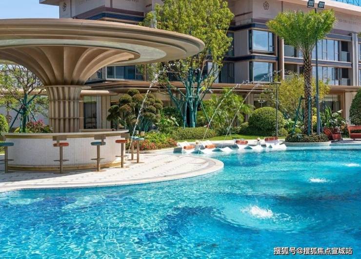 园林景观延续了滨江一贯的高水准,中心区域打造自然度假式景观水池,搭配葱郁的棕榈等热带植物,再辅以开放式酒廊与下沉卡座,营造出松弛惬意的度假氛围。