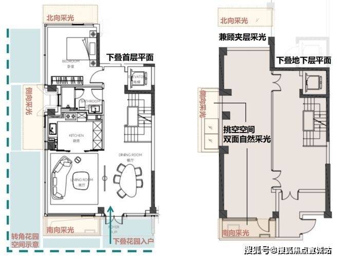 在全新开放的叠墅样板间中,可以看到叠墅产品不仅在南北两个方向,边套还在侧向都做了地下采光,再也不用担心地下室昏暗潮湿。