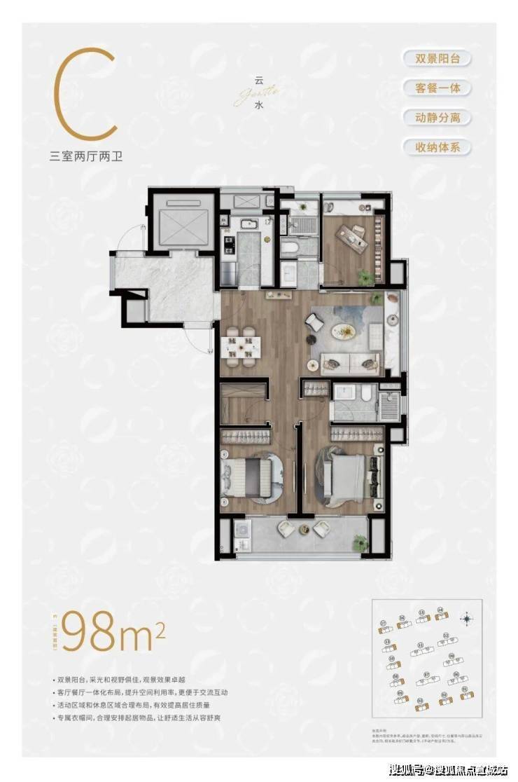 户型亮点:得房率达 82%,部分户型南向面宽达 10.2 米,搭配双阳台设计,采光通风俱佳;部分大户型采用双套房设计,主卧配备步入式衣帽间与双台盆卫浴。