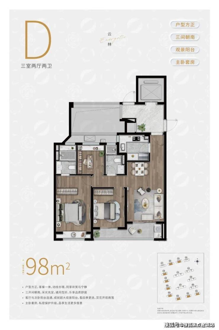 约98㎡3房2卫户型,三开间朝南,并且这贯穿客厅+次卧的超大阳台实在是惹眼,这个南向的视野延展度以及采光度相比同级别的户型来说,要更加出色。