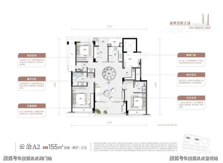 在售户型:高层主力户型为155平方米的4室2厅3卫,排屋户型建面约285-315平方米。