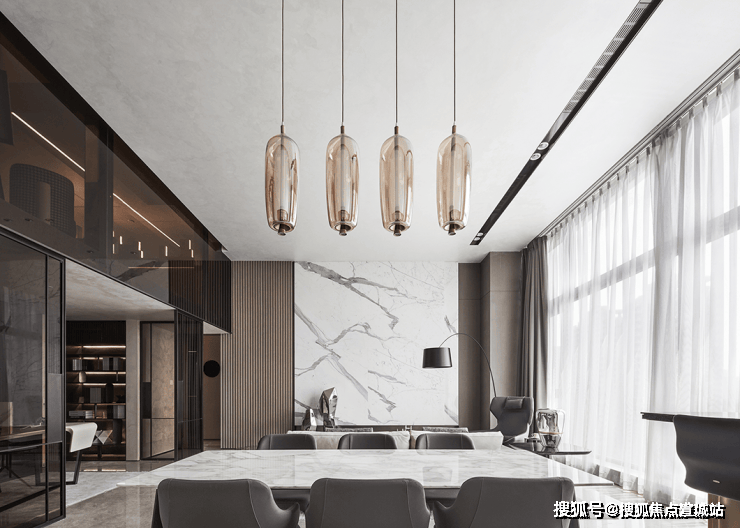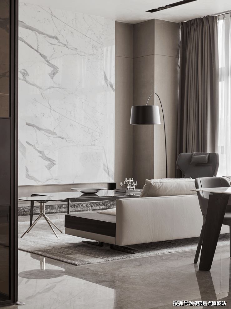 占据整体居所视觉中要的,是以鱼肚白大理石构成的客厅背景墙,线条明晰,行云流水,宛若破晓山涧,都市中突显的自然气息。