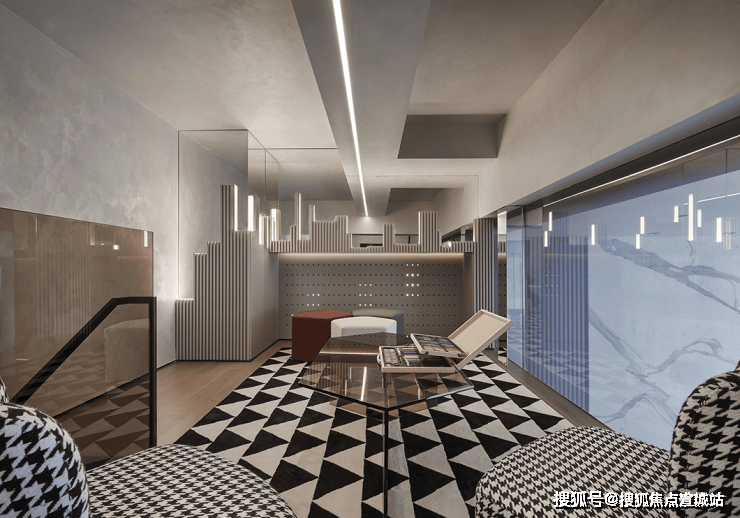大片深棕色落地玻璃,使整体宛如生长在室内的建造物,结构强烈,与空间有机结合。