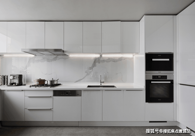客厅后侧是厨房,格挡是采用深色玻璃制作而成的推拉门,内部整体为白色柜面,墙体呼应客厅背景墙,以爵士白大理石为装饰,优雅温厚,细节充盈。