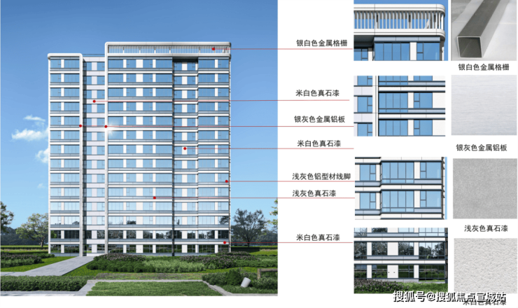色彩提炼:米白色真石漆与浅灰色铝型材,抽象提取“粉墙黛瓦”的色彩关系。