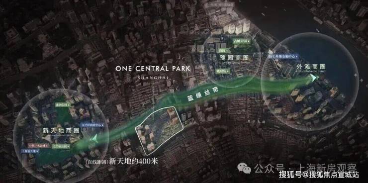 咫尺新天地蓝绿丝带上的关键节点距离新天地直线距离约400米,作为蓝绿丝带规划上的关键节点,随着大新天地东进南拓战略逐步实施,通过水景、绿地和公共空间,串联新天地、豫园、外滩三大世界级商业版图。未来,整个片区的商业规模将突破约28万方,商办总体量达到约150万方,商业配套、产业资源、生态规划的能级与量级得到新突破。预计未来围绕本地块约1.1平方公里内将吸引约7000个亿级家庭的聚集,成就上海乃至中国亿级家庭浓度最高的区域。