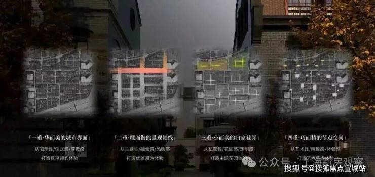 四重景观空间层层递进的隐居哲学从城市界面到节点空间,由大到小打造“四重空间感受”,营造中西和鸣的感官体验。从华而美的城市道路、糅而谐的景观轴线,美而精的归家巷弄、雅而巧的节点空间,每一处场景皆实现私密与艺术的交融,感受城市繁华与归家宁静的交叠。