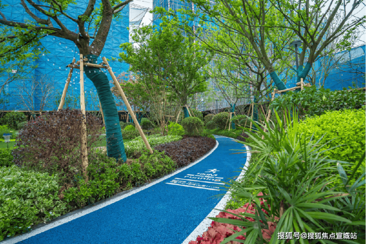 环绕在阳光草坪周围的彩色跑道,是串联全社区功能区的健身步道,总长约400米,按距离划分为热身区、起跑区和加油区,让业主可以悠然绽放运动的乐趣。