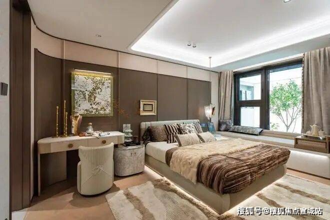 豪华的套房设计,北侧卫浴飘窗+南向床边双飘窗的设计,✅✅招商序售楼处电话:400-885-1337✅✅更是把这个空间的视野和收纳空间延展开来,尺度感真的很惊人。
